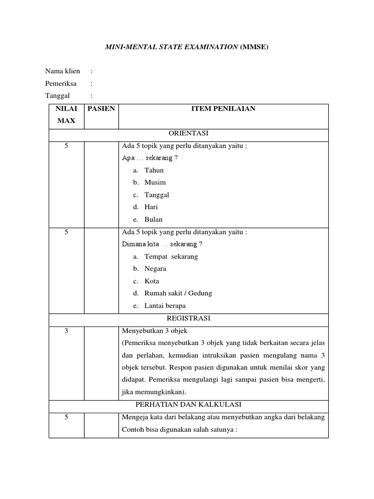 Pemeriksaan Kognitif Mmse from imgv2-1-f.scribdassets.com Amt merupakan instrumen untuk menilai fungsi kognitif pada lanjut usia dengan waktu yang lebih singkat dan sederhana daripada mmse. Mmse pada pasien abnormalitas pada pemeriksaan klinis dan neurologis / ad 8 > 2 / mmse < 24 periksa ulang 6 bulan kemudian. Tidak ada persiapan khusus sebelum melakukan pemeriksaan mini mental state examination (mmse). Masa perawatan demensia yang panjang menimbulkan beban kesehatan dan sosioekonomi yang berat kepada pasien, keluarga, masyarakat. Amt menilai memori baru dan lama, atensi, dan orientasi. Interpretasi skor mmse skor mmse pada pasien didapatkan 18 merupakan skor yang abnormal. Mulai dengan fungsi dasar tingkat kesadaran, kemudian fungsi kognitif dasar seperti berbahasa dan pemeriksaan yang lebih kompleks seperti berhitung, pertimbangan dsb. Teknik penggunaan mini mental state examination (mmse) adalah dengan wawancara langsung dengan pasien.